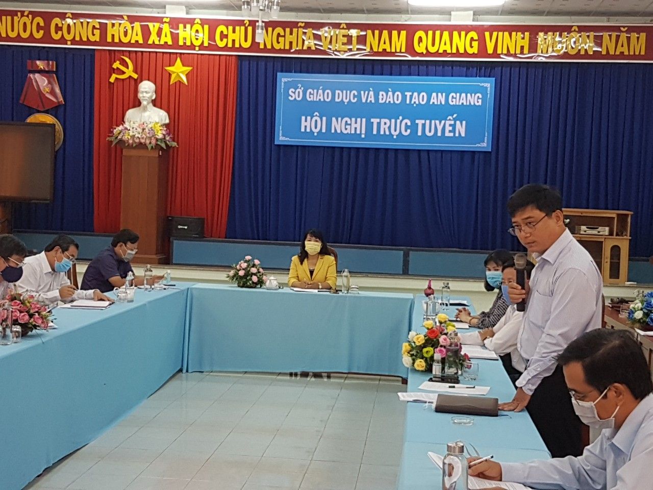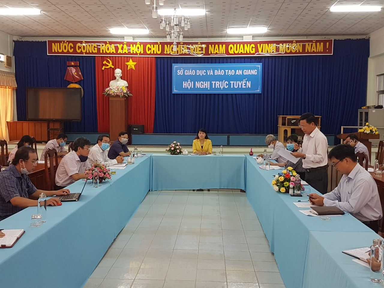 Ngày 29 tháng 4 năm 2020, Sở Giáo dục và Đào tạo (GDĐT) phối hợp với Viễn thông An Giang (VNPT) tổ chức Hội nghị giao ban ngành GDĐT, lần 2, năm học 2019 – 2020 bằng hình thức trực tuyến. Tham dự và chủ trì Hội nghị tại điểm cầu trung tâm có Ban Giám đốc Sở GDĐT; đại biểu các đầu cầu bao gồm đội ngũ Cán bộ quản lý ngành GDĐT toàn tỉnh: Trưởng phòng, Phó Trưởng phòng chức năng thuộc sở, Trưởng phòng GDĐT, Hiệu trưởng/Giám đốc các cơ sở giáo dục trên địa bàn tỉnh An Giang. Hội nghị đã tập trung thảo luận những khó khăn, vướng mắc và đề ra các giải pháp khắc phục trong quá trình tổ chức các nhiệm vụ sau khi học sinh đi học trở lại đồng thời đảm bảo an toàn trong phòng, chống dịch Covid-19.